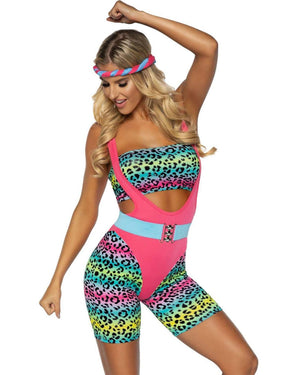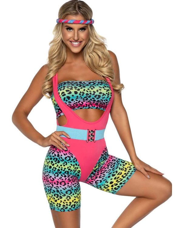Heart rates will rise when you wear this 80s Cardio Cutie Womens Costume. The costume includes a rainbow leopard print bandeau and matching bike shorts with an attached pink leotard. Also included is a blue elastic belt with silver buckle and a pink and blue 80s headband.