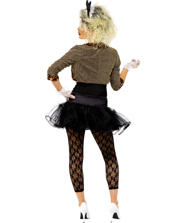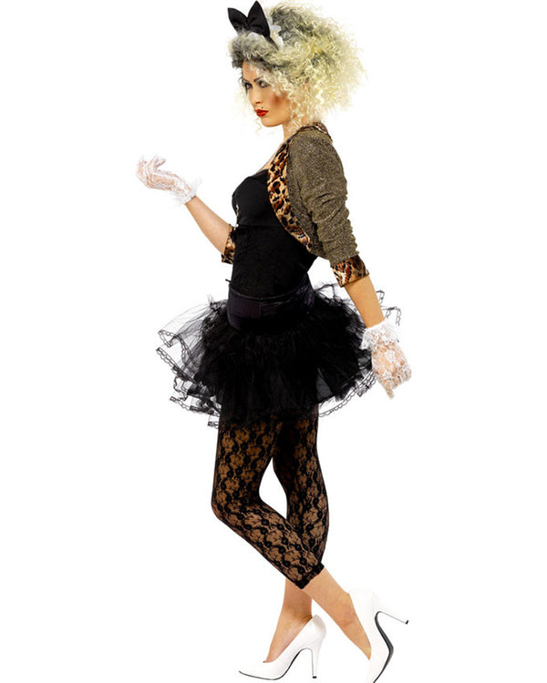 Get the Madonna look with this 80's Wild Diva Womens Costume featuring everything you remember or have heard about the 80's - lace, gloves, messy hair, mixed up dressing! Take yourself back to the awesome eighties when you put on this black top with a lace trimmed neckline and a gold shimmer bolero jacket with leopard printed edging. A black lace tutu with tie at the back and lacy leggings are included together with a white pair of short lace gloves. A black headband adds the finishing touch. Wear your hair messy or choose a wig and wear white or black stilettos.
