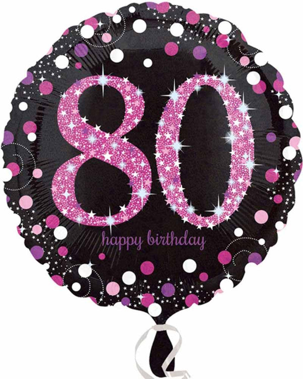 Celebrate your loved one's big birthday milestone with this 80th Sparkling Holographic Standard Foil Balloon. The balloon features the number 80 and the words 'Happy Birthday' written in pink with a holographic finish and an attractive border of holographic dots and stars in shades of pink on a black background.