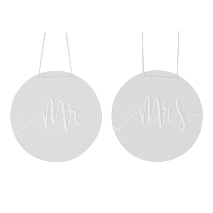 Shipped by our trusted partnerEach pack contains: 1 of each Mr and Mrs chair sign measuring 30cm diameter with cotton rope to attach to each. Please peel off the protective film before use.