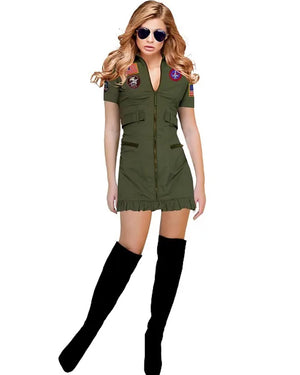 Be ready to take flight in this Air Force Pilot Womens Costume. The costume comes with a mini khaki dress with a zip up front and a belt. The dress is also decorated with embroidered military-style patches to give it an extra sense of authenticity. Perfect for wearing to any military-themed party, for a Top Gun event and air force theme, just add your own aviator sunglasses and boots.