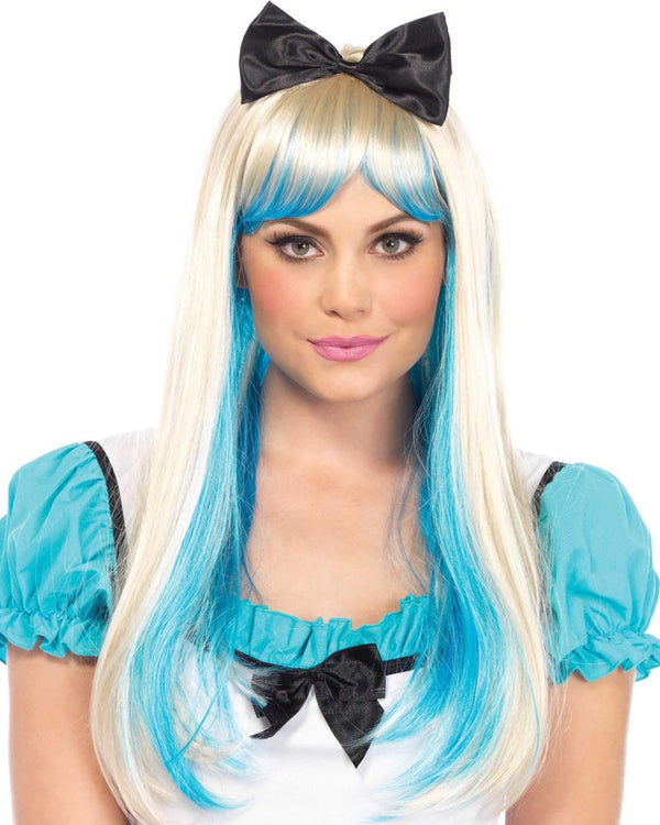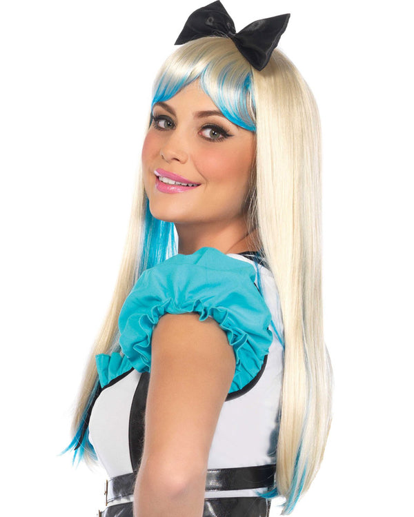 Take a trip down the rabbit hole and chase that mischievous white rabbit while wearing this Alice Two Toned Blonde Blue Wig with Black Bow. As you enter Wonderland you'll defeat the cruel Queen of Hearts and hang out with your friends Mad Hatter and the Mad Hare. Wig comes in platinum blonde with an underneath of bright blue and includes a black bow. Wig Flows down to just below your shoulder blades with swept bangs in the front. Perfect for matching up with any Alice costume.