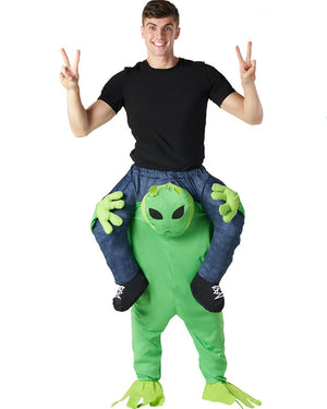 Let the little green men carry you off into the unknown with this Alien Piggyback Adult Costume. The costume features piggyback pants with faux legs, making it look like you're being given a piggyback ride by a little green man from outer space. Perfect for any funny or space-themed party.