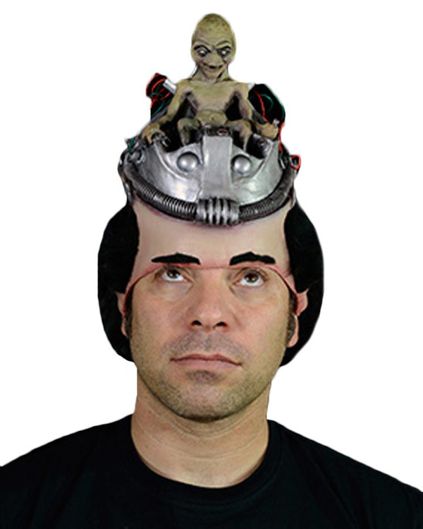 Show people who really controls your thoughts with this Alien Pilot Headpiece. This fun one-of-a-kind mask sits on your head like a hat, with a very detailed alien console on top and a green alien at the controls. The silver console is made to look as though it has been stapled to your head, and the wires connecting your brain to the alien's control centre are clearly visible from the back and sides. The latex headpiece also features hair and eyebrows that fit over the top of your own for a highly convincing look.