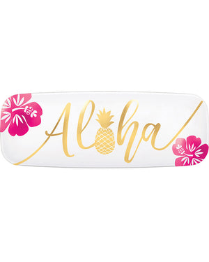 For a sophisticated touch to your Hawaiian Luau party, this Aloha Gold Plastic Platter will be exactly what you need for serving up some delicious tropical snacks. This white rectangular platter features 'Aloha' printed in gold in the centre with a gold pineapple replacing the 'o' and two pink hibiscus flowers on either side. Pile up your snack, fruit or drinks on this platter. Combine with our range of Aloha party supplies including party cups, party plates, table covers and more.