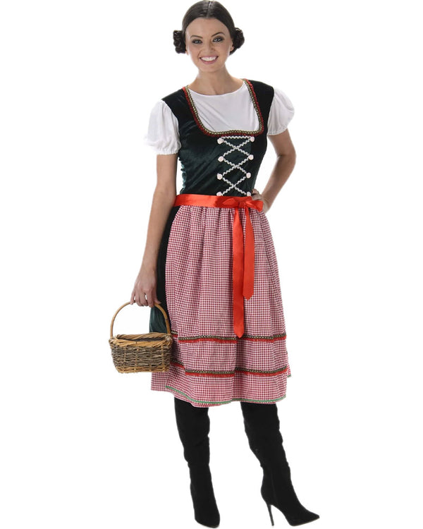 Be ready for Oktoberfest in this Alpine Girl Womens Costume. The costume comes in the style of a traditional Dirndl dress in green with a mock lace up design on the bodice and attached white shirt underneath, as well as a red checkered apron attached over the skirt at the front. To complete the look, a red sash is included with an attached bow. Great for German or International themed parties, Harmony Day and Oktoberfest.