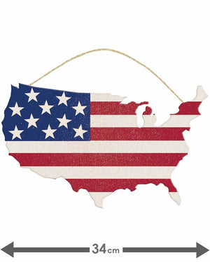 Show your patriotism for the US of A with this American Patriotic USA Glitter Sign. The sign is made of fibreboard with a glittering flag in the shape of the United States. A rustic-looking rope hanger is attached. Great for 4th of July celebrations.