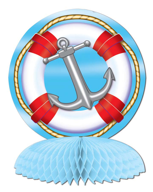Well er...on the table please. Use this Anchor Centrepiece to decorate your party table. Perfect for a nautical or sailor themed party. The centrepiece is a card cutout of a lifebuoy and anchor on a honeycomb paper base. Measures 25cm / 10in high.