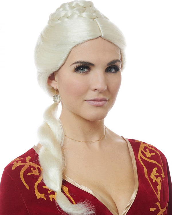 Command armies and dragons in this Ancient Princess Platinum Blonde Wig that's perfect for cosplaying any medieval or fantasy princess. The wig is styled in a platinum blonde updo with a braided bun and a single twist of hair at the bottom that comes down just past the shoulder. Wear a wig cap for added comfort and to keep your own hair under wraps.