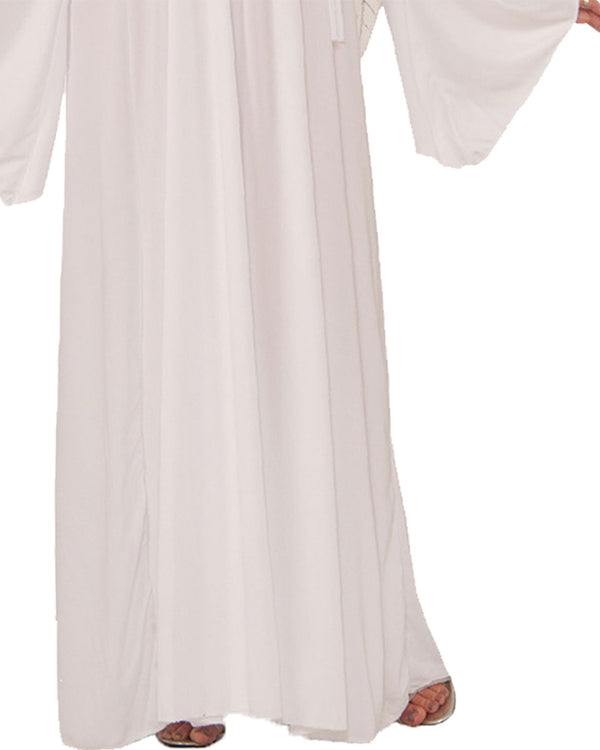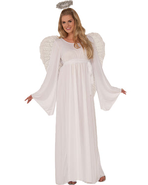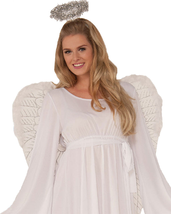 Offer your blessings and be a beacon for all hope and light with this Angel Classic Womens Costume. It's perfect for Christmas events, nativity plays and more as it comes with a white dress with long bell sleeves, a white sash to tie around the waist and a silver tinsel halo on a headband. Add your own wings and a harp and you're ready for your celebrations.