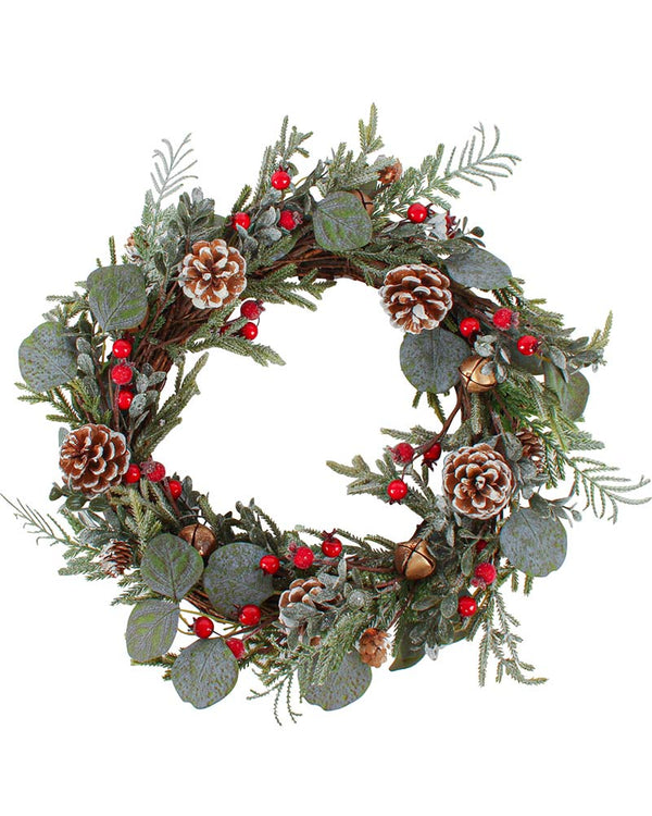 Be sure to add this Antiqued Bell Wreath 51cm to your front door this year. The wreath features a circle of artificial pine with a range of small berries and an assortment of frosted leaves. In between are artificial pinecones and small gold bells. Perfect for a natural or traditional festive look this Xmas. Combine with our range of Christmas decor including Christmas swags, garlands, tree decorations and more to create the perfect Christmas setup.