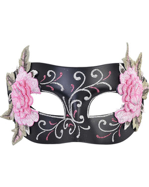 Why wear a boring eye mask to conceal who you are when you can dance the night away wearing this Aria Black and Pink Eye Mask. This gorgeous mask covers only the eye area and comes in matte black and features pink and silver glitter swirls painted along the front and on either side of the mask are two sewn 3D pink flowers with attached pale green leaves. The mask also features black ribbon to fasten the mask around your head. This stunning mask can be worn with a number of outfits and costumes. Perfect for your next masquerade party or event.