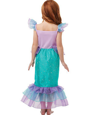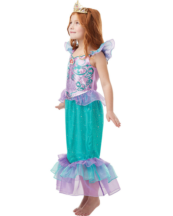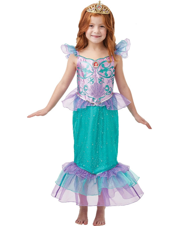 Any lover of the Disney movie 'The Little Mermaid' will adore this Ariel Glitter and Sparkle Girls Costume. The costume includes a dress with purple satin bodice that features glitter-finish pattern, sparkly clam fish design, Ariel motif and tulle frill sleeves. The dress also features aqua blue sparkly pencil skirt with digital printed scales as well as layered ombre tulle fin and tulle peplum detail at the waist. To complete the look also included is a gold painted plastic tiara with faux jewels and Ariel motif.