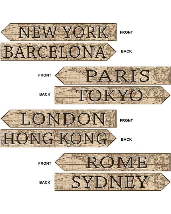 Take a trip across the globe with these Around the World Street Sign Cutouts Pack of 4. Included are four double sided signs that have a world map printed on the background and the name of a capital city written in black. Combine with our range of around the world party supplies including party cups, party plates, tablecovers and more.