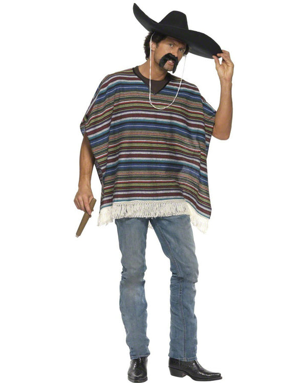 Authentic Mexican Poncho Mens Costume for that bandido look. In subtle colours with white fringe around the hem. Just add your jeans a mo and a sombrero and you're ready to go! Also makes for a great cowboy/western accessory.