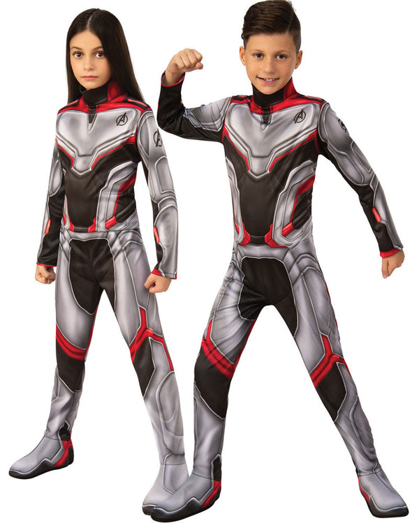 Step into the officially licensed Endgame Team Suit Kids Costume and join the Avengers as they enter the final battle against Thanos. This silver black and red jumpsuit is unisex and features padding to help shape powerful muscles! Boot tops are attached, and have a handy strap to go over your shoes and keep the newest Avenger's team suit neatly in place! This costume is perfect for all the kids who are more than ready for the Endgame to begin!