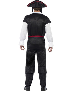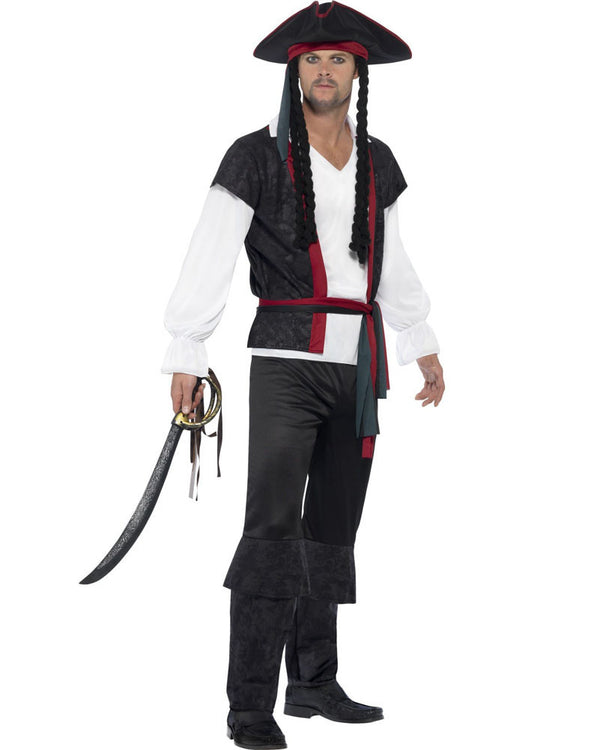 Make those scurvy dogs walk the plank in this Aye Aye Pirate Captain Mens Costume. The costume features a white long-sleeved top with an attached black and red vest and a matching sash. The black pants are designed with attached boot cuffs to turn your regular shoes into sea-worthy boots. A tricorn hat with attached hair tops off the costume. Perfect for Book Week or any pirate themed event.