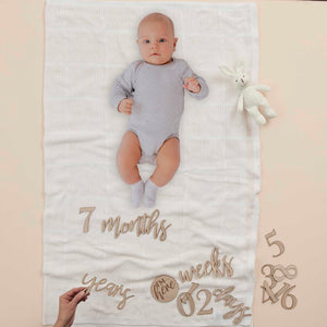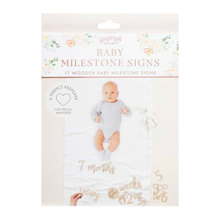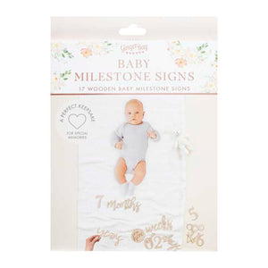 Capture all those precious daily, weekly, monthly and annual milestones with this Baby In Bloom Milestone Mix and Match Signs Pack of 17. Included are 17 wooden signs including numbers 1-9 and days, weeks, months and years signs. The perfect baby shower gift for the mummy to be.