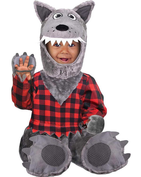 Let everyone join in on the Halloween dress up fun and dress them in this Baby Wolf Toddler Boys Costume. This costume features a jumpsuit with a black and red checkered top with a jagged hem and two grey fluffy wolf paws at the cuffs. There is attached a pair of grey faux fur legs. The costume also features a pair of grey faux fur wolf paws booties and a fluffy grey hood with a plush wolf face on the top.