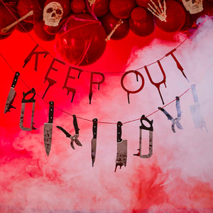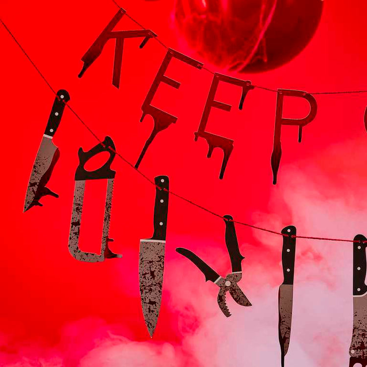 Shipped by our trusted partnerContains: 1.5m long bunting with "keep out" measuring 75.8cm, 1.5m long bunting with 12 weapons in varying size and look, and dark red twine with additional 37cm of string at either end.