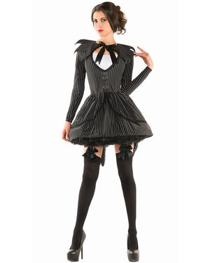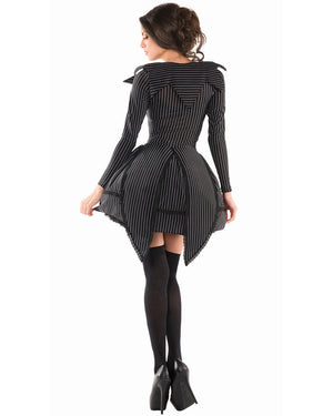 Give everyone around you nightmares this Halloween in the Bad Dreams Babe Womens Costume. This costume comes with a pin-striped long sleeve dress featuring a keyhole neckline with white inset panel, pointed collar, black buttons, black bow details and built-in coat tails with black lace trim.