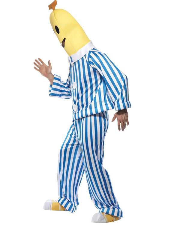 Get retro with this hysterical Bananas in Pyjamas Mens Costume, based on the 1992 TV show adored by kids and adults alike. The dress-up costume features a blue and white striped top that features a white collar with interchangeable B1 or B2 number. Also included is a pair of blue and white striped pants with an elastic waist band. To complete the look, also included is a yellow banana headpiece with mesh mouth to see through as well as yellow and white felt shoe covers. The headpiece attaches to the neck of the shirt with velcro.