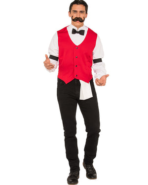 Any budding bartenders would love our Bartender Mens Costume. Adapted from the classic 20s bartender look featuring a long sleeve white shirt with a mock red vest, a black bow tie and 2 black armbands. Also featuring a brown moustache and white rag, complete the look with black trousers and black shoes! Great for serving your mates drinks at your next 20s themed party!