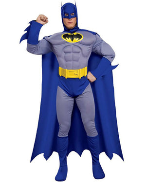 This Batman Brave and Bold Deluxe Muscle Chest Mens Costume is based on the original TV series with the update of a padded, moulded muscle chest for extra villain building strength! This grey and blue jumpsuit is made of polyester and is easy to wear and care for. Comes with a yellow moulded plastic belt that ties at the back and a headpiece and cape. This is an officially licensed Batma costume by DC Comics.