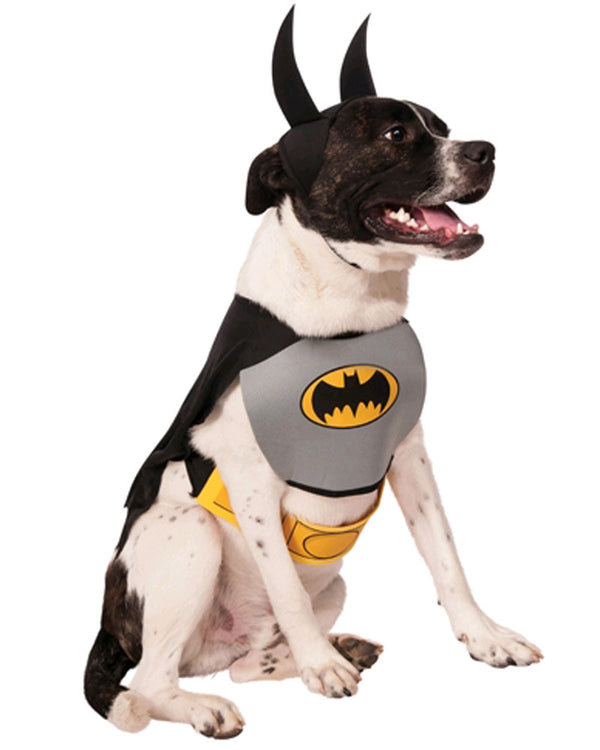 Dress up your doggy pal in this Batman Classic Pet Costume. The simple costume includes a black cape, a printed chestpiece, belt and iconic headpiece with long ears.