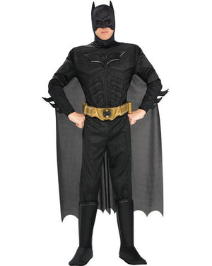 It's your turn to don the batsuit and save Gotham from the Joker. This officially licensed Dark Knight Rises Deluxe Mens Muscle Chest is perfect for that superhero look. The black jumpsuit features a muscle effect chest built in to the suit with a detachable cape and attached half mask and a moulded gold belt that ties at the back. The jumpsuit fastens at the back with velcro.