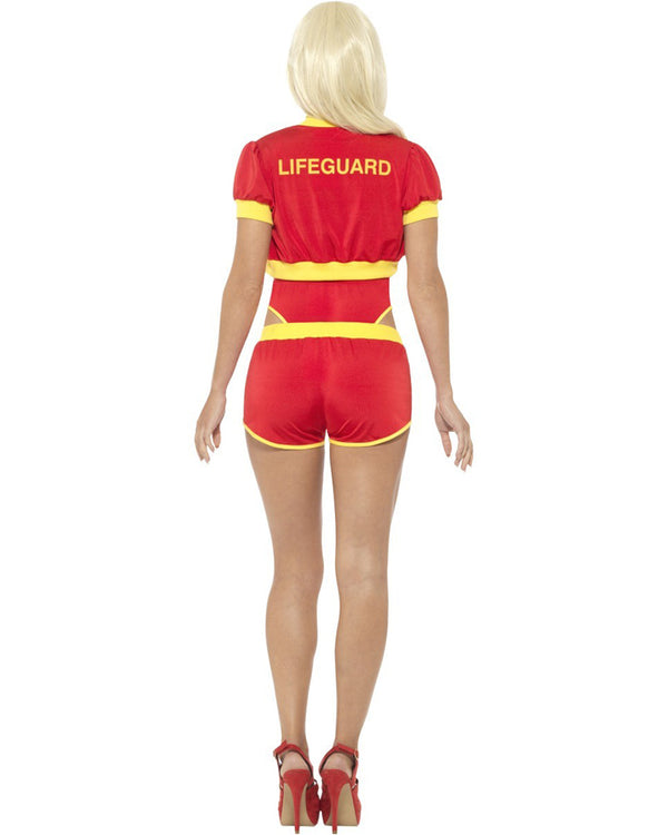 This Baywatch Lifeguard Womens Costume is an officially licensed costume based on those in the 2017 Baywatch movie. The costume is all red with bright yellow trim. The swimsuit has the classic Baywatch high rise cut, a short jacket, short shorts and a whistle.