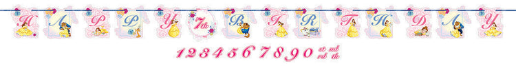 Decorate your party with this enchanting Disney Beauty and the Beast Add An Age Banner. The banner features the words 'Happy Birthday and a place in the middle for you to add an age. The jumbo-sized banner comes with 2 sets of the numbers 0-9 as well as ST, ND, RD and TH so you can customise the message for the occasion. Comes with strings for hanging. Combine with our range of Beauty and the Beast party supplies for a beautifully coordinated princess party for your little girls birthday celebration.
