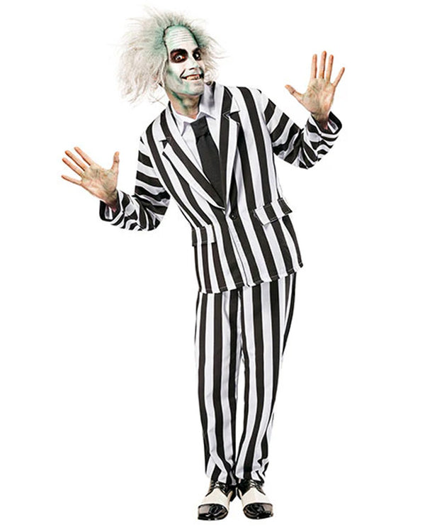 Step into the ghostly world of Beetlejuice with this Deluxe Men's Costume! This iconic look comes straight out of the afterlife, featuring a black and white striped suit jacket that's sure to turn heads in both the living and the dead realms. Also included with the white faux shirt and black tie for that eerie yet stylish touch. Oh, and don't forget the matching striped pants to complete the Beetlejuice-inspired look from head to toe! Whether you're summoning spirits at a costume party or just feeling a bit mischievous, our Deluxe Men's Costume is sure to make you the ghost with the most!