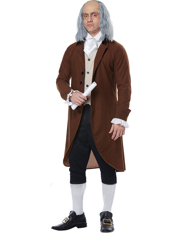 Step back in time in our Benjamin Franklin Mens Costume. Become one of the most influential founding fathers of the colonial era in the United States of America, Benjamin Franklin or just step back in time and become Colonial man! Featuring a quality brown buttoned up jacket with white ruffled sleeves, black trousers, a tanned buttoned vest and a white cravat (necktie). To complete the costume finish up with long white socks, shoe covers and a white shirt!