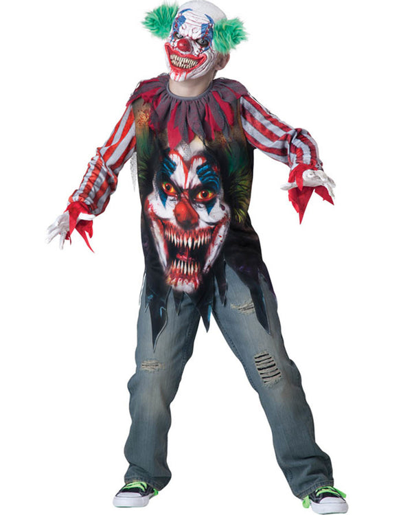 Clown around in this Big Top Terror Clown Boys Costume featuring a shirt with clown print, collar and vinyl mask with plush hair.