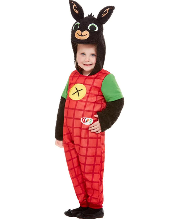 Join Flop, Pando and Charlie in this Bing Deluxe Toddler Costume. Your little one will love becoming Bing the bunny for playtime or any dress up occasion! The costume features a cute checked red jumpsuit with a fibre filled chest and velcro for easy fitting. The costume is also styled with a large printed yellow button on the chest, green and black fleece long sleeves and an attached black fleece hood with Bing's smiling face.