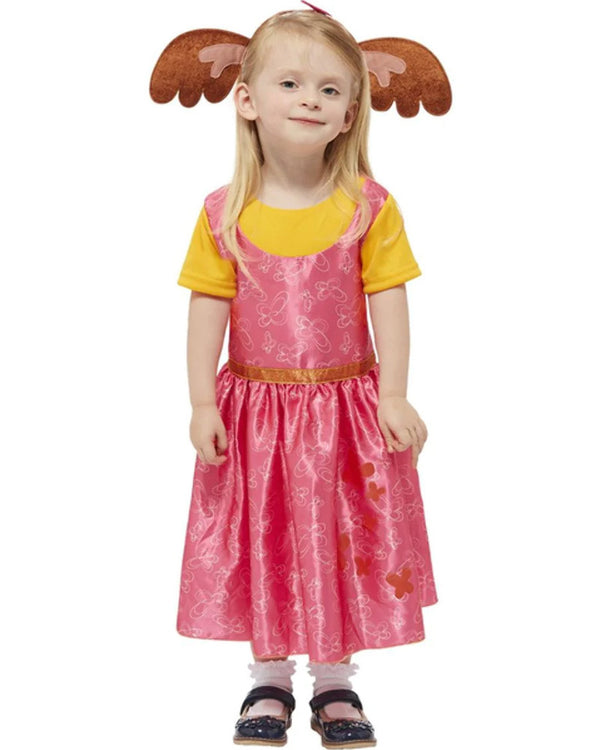 Join Bing, Pando and Charlie in this Bing Sula Deluxe Toddler Girls Costume. Your little one will love becoming Sula the adorable little elephant for Book week or any dress up occasion! The costume features a pink dress with a subtle white flower printed pattern, gold ribbon around the waist and an attached yellow short sleeve top underneath. To transform into the Sula, there is an included brown headband with attached elephant ears.