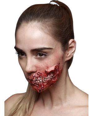 Turn heads when you roam the streets this Halloween with this Bite Me Mouth Luxury FX Appliance Transfer! This fantastic special effects prosthetic fits over one side of the mouth to make it look like your skin has been ripped apart or eaten away by zombies to reveal your gums and teeth! Maybe you were part of an epic love story that saw your beloved turn into a zombie and in a final moment of passion, you kissed them goodbye, only to have them complete their zombie transition mid-kiss and then they ate your face off. Grab some spirit gum adhesive to stick this gory wound to yourself, use your own foundation to blend the edges into your skin tone and add some fresh fake blood for the ultimate impact!
