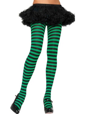 Add some striped fun to your next costume or outfit with these Black and Kelly Green Striped Tights. These fun tights feature black and green stripes with a reinforced toe.