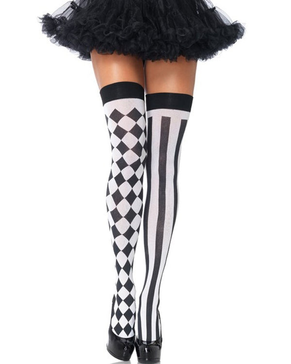 Pull on these quirky Harlequin Thigh High Stockings and complete any Harlequin costume. One stocking features a checkerboard print whilst the other has vertical black and white stripes. Crazy!