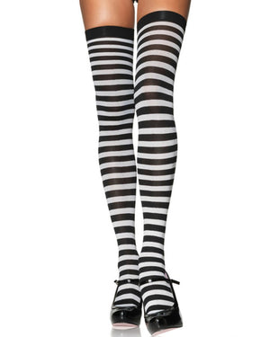 Fabulous and fun Black and White Striped Thigh High Stockings, made from nylon, easy to wear and certainly designed to get you noticed. Great paired up with so many of our costumes to truly make you stand out from the crowd.