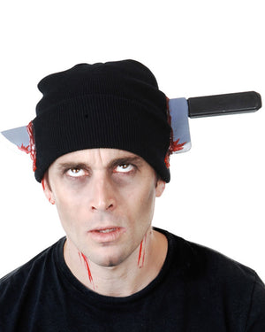 This Black Beanie with Bloody Knife has a great impact for Halloween. Features a black beanie pierced with a plastic, blood stained, butcher knife to give that knife through the head look. Just add some blood to your face and neck to complete the scary look.