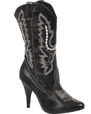 You'll be ready to catch a bandit in the wild, wild west wearing these Black Cowgirl Womens Boots! These boots are styled in the classic Western design and feature a heel, distressed polyurethane fabric and silver stitched detailing. Perfect for your Cowgirl costume at your next Western-themed event.