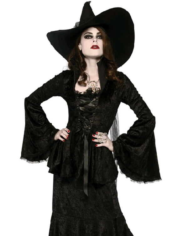 Whatever the look, this Black Crushed Velvet Top is sure to add an air of allure to your costume this Halloween! This black velvet top features cross-over ribbon detailing at the front, a ruffled neckline and bell sleeves. Perfect for witch costumes, just don't get lost on your way to the Wicked West!