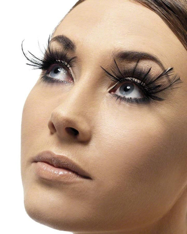 Wear these long Black Feather Eyelashes to compliment your costume. A stunning effect that will make you stand out in the crowd! Add these to your own lashes with the included adhesive and transform yourself into a showgirl!