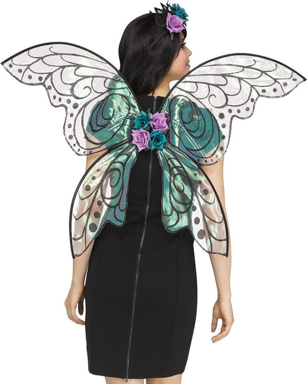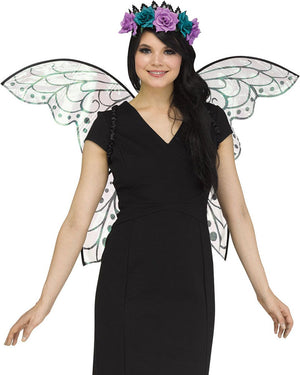 Transform into a dark fairy with these Black Glitter and Purple Fantasy Fairy Sparkle Wings that are perfect for your next fancy dress party. The wings come in a sheer light purple material with glittery black wing detail and a bunch of purple and blue coloured faux flowers in the center. Elastic straps hold the wings in place, just pair with your own flower crown and other magical dark fairy accessories.