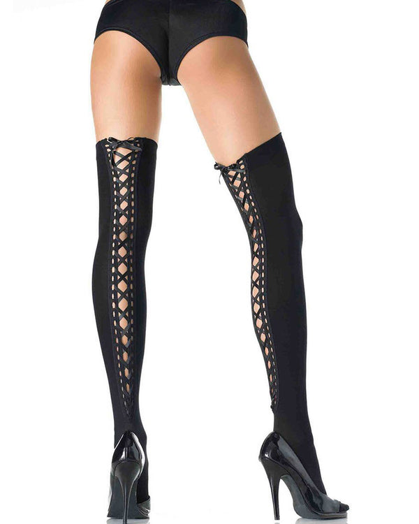 Wear these super sexy Black Lace Up Back Thigh High Stay Ups and add a little risquè glamour to your costume. The top bands contain silicone to help them stay put and the lacing can be adjusted for comfort.