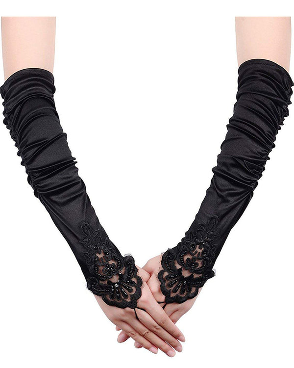 These Black Long Satin Fingerless Gloves with Lace are perfect for 1920's or burlesque style costumes. Features ruched sides and decorated with lace and black beads with a loop for your middle finger. Fabulous!
