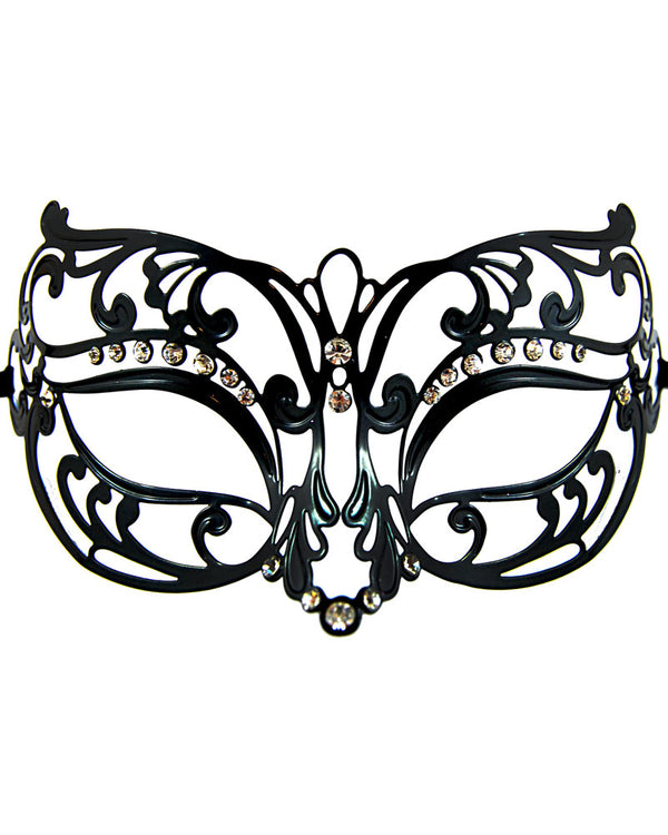 If you're after the perfect elegant mask to wear to a masquerade party you can't go wrong with this Black Metal Masquerade Mask. The mask is made of black metal in a swirled pattern with dimante detail throughout as well as ribbon tie at rear.