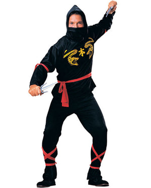 Get ready to fight off your enemies. Our Black Ninja Mens Costume includes a black hooded shirt with dragon detail over the chest, matching black pants, face scarf, red waist sash, arm ties and leg ties. Make sure you step steathily.